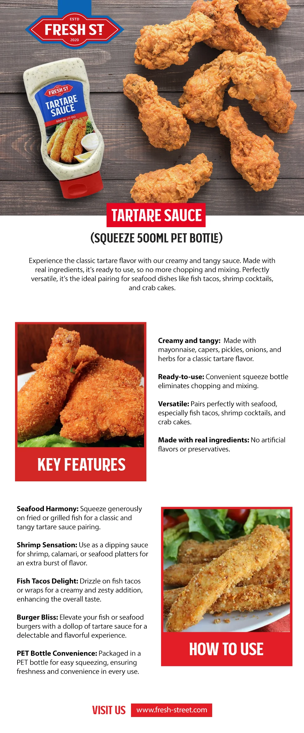 Experience the classic tartare flavor with our creamy and tangy sauce. Made with authentic flavors, it's ready to use, so no more chopping and mixing. Perfectly versatile, it's the ideal pairing for seafood dishes like fish tacos, shrimp cocktails, and crab cakes.